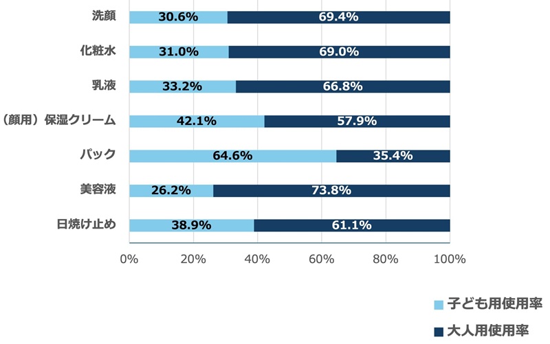 スキンケアアイテムは、家族といっしょにおとな用を使っている子が多く、中にはおとなが使うパックや美容液を使っている子も!日やけ止めも、6割以上がおとな用を使っているという結果に!