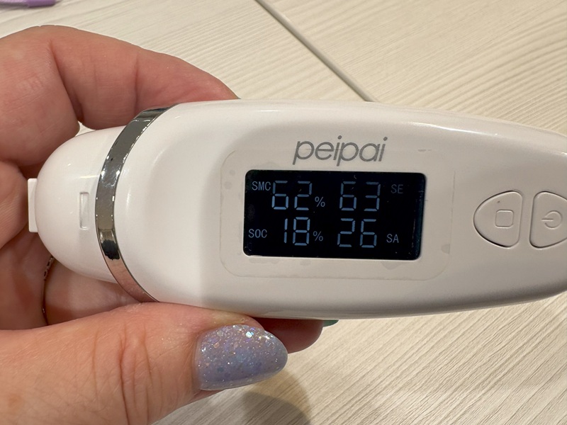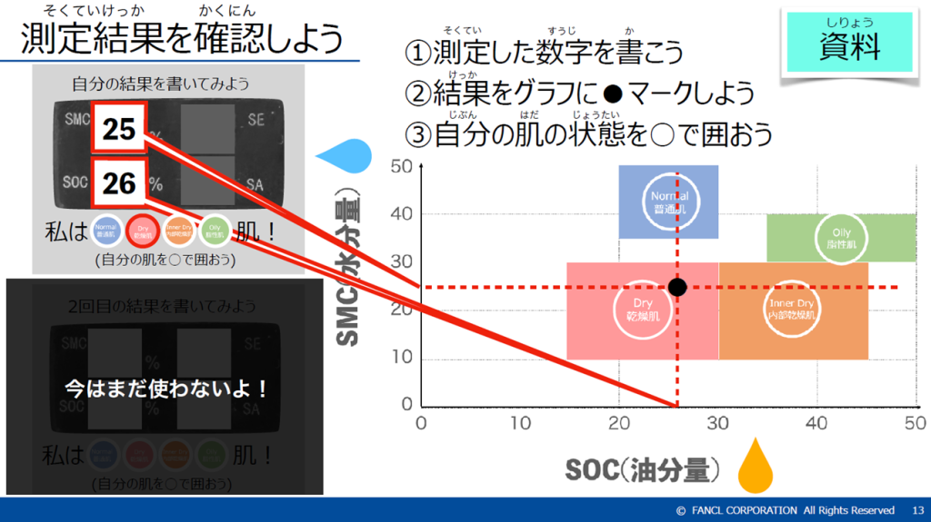 それから、「油分・水分チェッカー」という機械を使って、肌の油分と水分をはかってみたよ! 肌にあてると、肌の油分、水分が数字で表示!