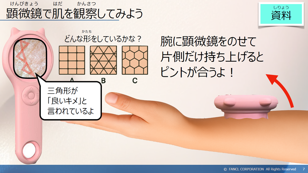 教室では最初に、自分の肌を知るために、顕微鏡で肌を観察してみたよ!