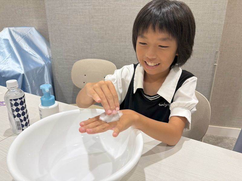 2プッシュして、こすらずにやさしく洗って水で流すよ♪洗い終わってふきとる時もやさしくね!