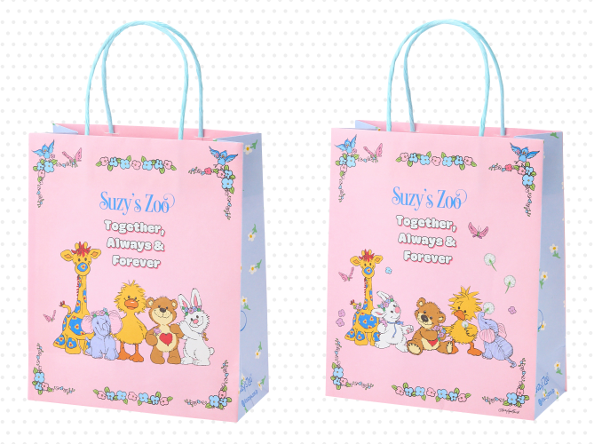 お買いものをするとスージー・ズーポップアップストア限定デザインのショッピングバッグが無料でもらえちゃう☆パステルピンクとブルーのカラーに、ウィッツィーたちがかわいく並んだデザインだよ♪
