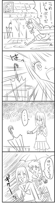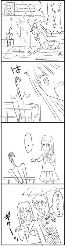 突然の雨に、他人の傘に手がのびて…。ふと魔がさす気持ちを描いたんだね。ゆれ動くココロ‼
