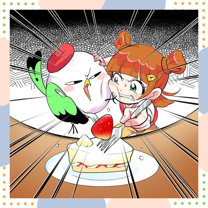 ケーキをめぐるみっくちゃんとペンぴよの争い。緊迫したバチバチな雰囲気を出しているのは、ポーズや表情だけじゃないみたい!