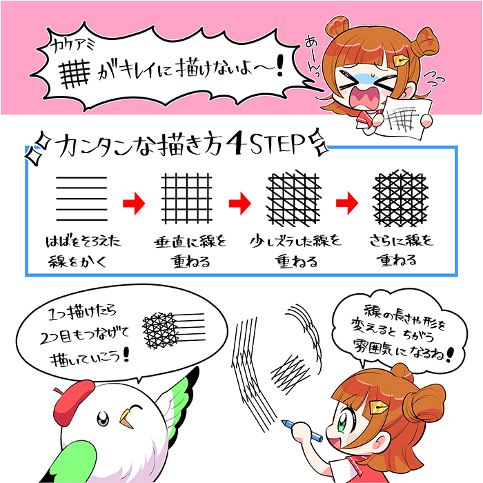 これはね、まんがのテクニックでよく使われる「カケアミ」という描き方なんだよ。最後のコラムで描き方を説明しているから、練習してみて!