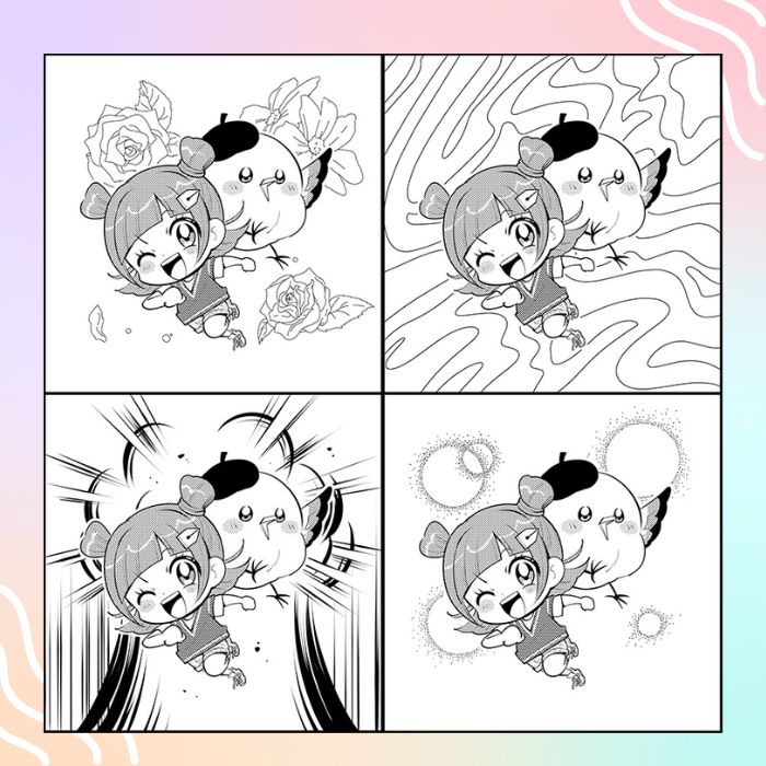それなら、前回と同じようにコマ全体にがらを描くといいよ。今回もキャラをまん中に置いて、定番のがらを説明するね。