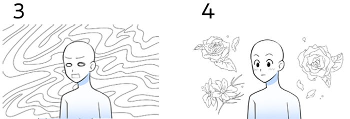 混乱や、動揺する精神状態を表す。また、空間のゆがみを感じさせて、異次元へのワープ移動を描く時に使われることも。