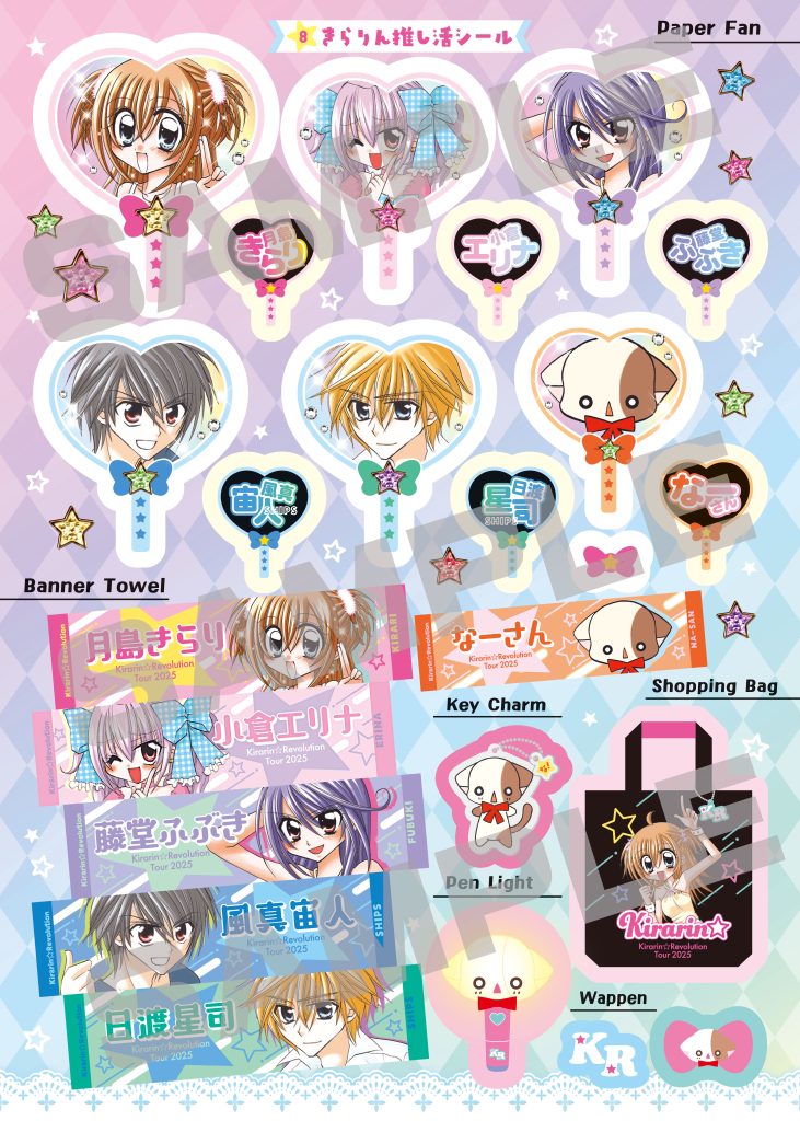 きらりちゃんやSHIPS、エリナ、ふぶきがタオルやうちわ、ペンライトなど「Kirarin☆Revolution Tour 2025」のツアーグッズ風シールになっているよ。