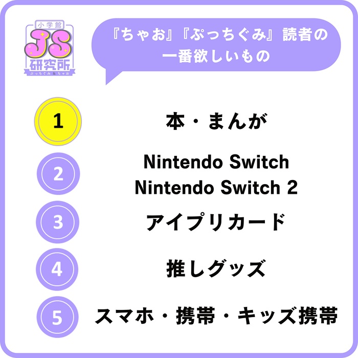 「本・まんが」のほか、3位にアミューズメントゲーム「ひみつのアイプリ」で使える「アイプリカード」、4位に「推しグッズ」がランクイン!!コレクションしたものを見せ合ったり交換したりして、友だち同士で楽しめるものがランクインしてたよ♪