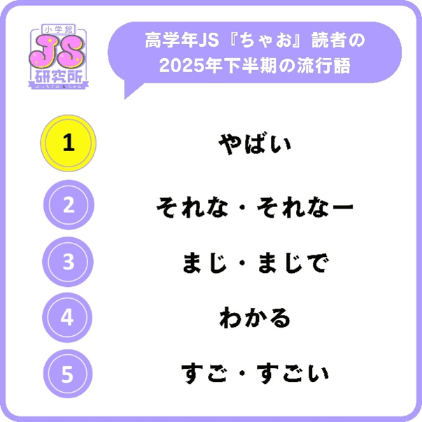 1位「やばい」、2位「それな・それなー」、3位「まじ・まじで」、4位「わかる」と、友だち同士で共感したり、コミュニケーションをスムーズにするような、わかりやすく使いやすい言葉が上位になったよ!ちゃおっ娘世代は、友だちとの関係を大事に思っている子が多いみたい♪