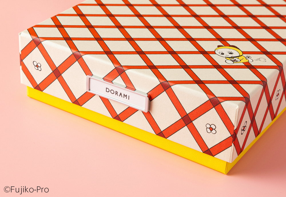 ドラミちゃんをイメージしたチェック柄とお花があしらわれた、赤と黄色がはなやかなお道具箱♪箱を開けるとふたの内側にもドラミちゃんの絵が!