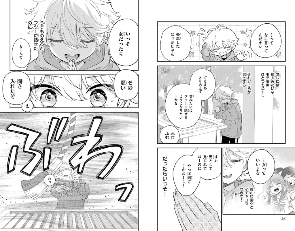 幼なじみの女の子が好きだけど「上杉が女の子だったらめっちゃかわいくない!?」と話しているのを聞いてしまう。幼なじみの瑛人より身長も勉強も勝てないし、失恋もしちゃうし。落ち込む上杉くんは、おつかい帰りに神社に寄ってお願いをしてみると・・・女の子になっちゃった!?