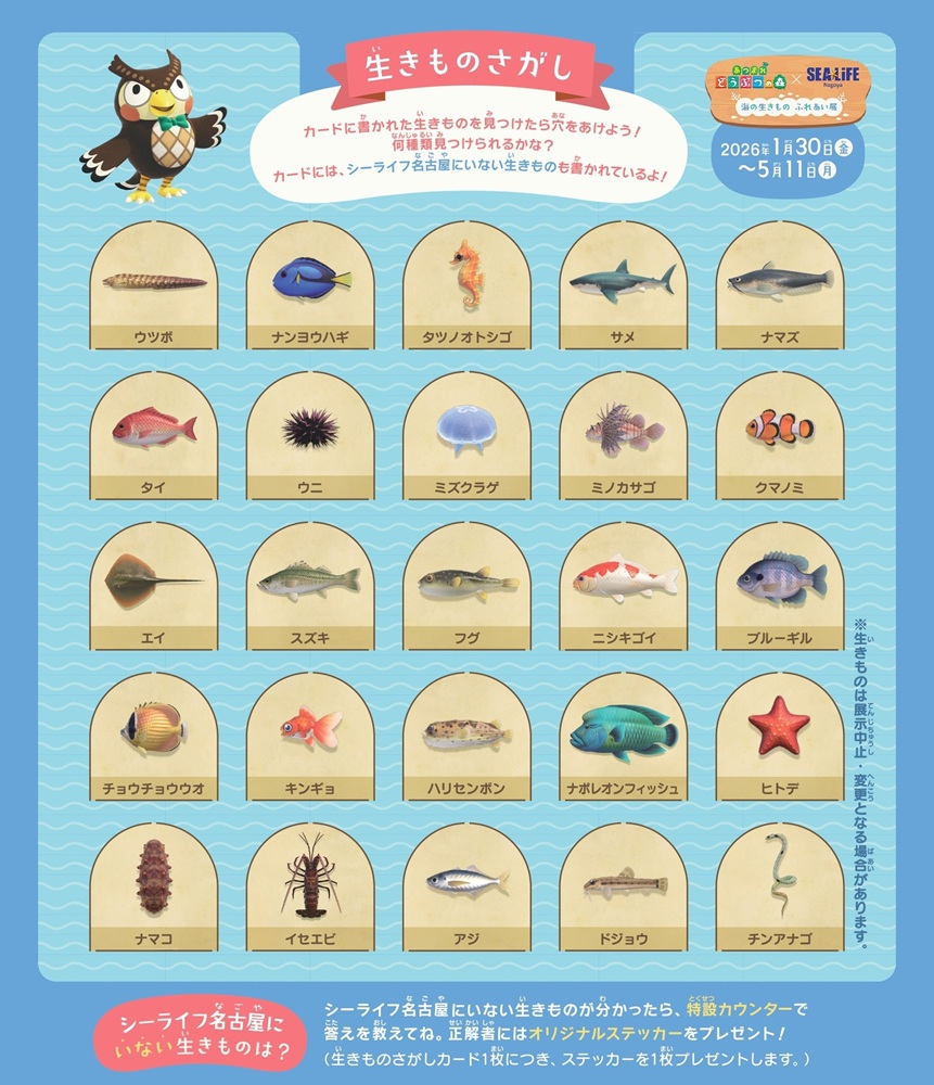 「あつまれ どうぶつの森」に登場するサカナや海の幸を探す「生きものさがし」カードを販売!カード内には1種類、水族館に展示されていない生きものがあって、その生きものが何かわかった人には、限定ステッカーをプレゼント!