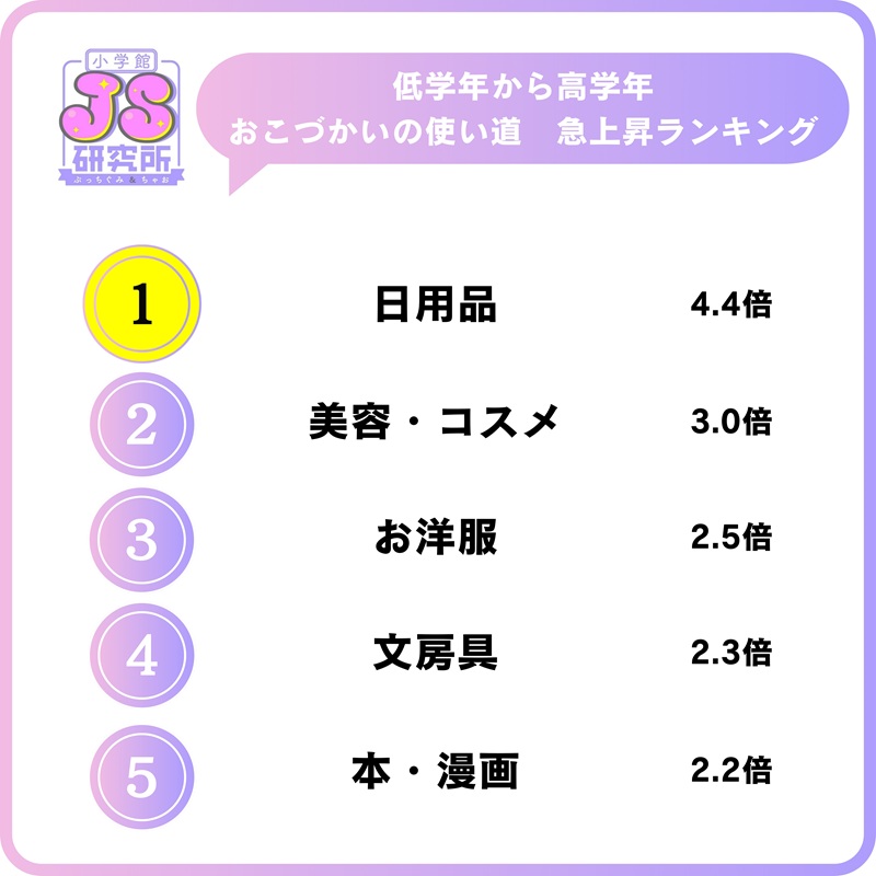 おこづかいを「遊び」に使うことが多い低学年の子に比べて、高学年になると「日用品」、「美容・コスメ」、「お洋服」に使う子が多くなって、毎日使う実用品や、自分みがきのためのアイテムに使い道が変わっていくことが、今回の調査で判明!!
