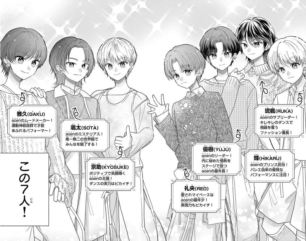 メンバーは、リーダーの優樹(YUJU)くん、琉楓(RUKA)くん、雅久(GAKU)くん、輝(HIKARU)くん、颯太(SOTA)くん、京助(KYOSUKE)くん、礼央(REO)くん。