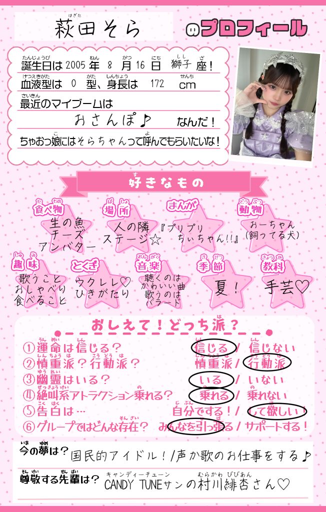 裁縫が大好きで次に何を作ろうか調べていると、アイドルの衣装が出てきて、衣装がとてもかわいくてアイドルに興味をもちました。そのあと夏フェスにはじめて行き、FRUITS ZIPPERさんとCANDY TUNEさんに引きこまれ、自分もアイドルになりたいと思いすぐ、KAWAII LAB.のオーディションを受けました!