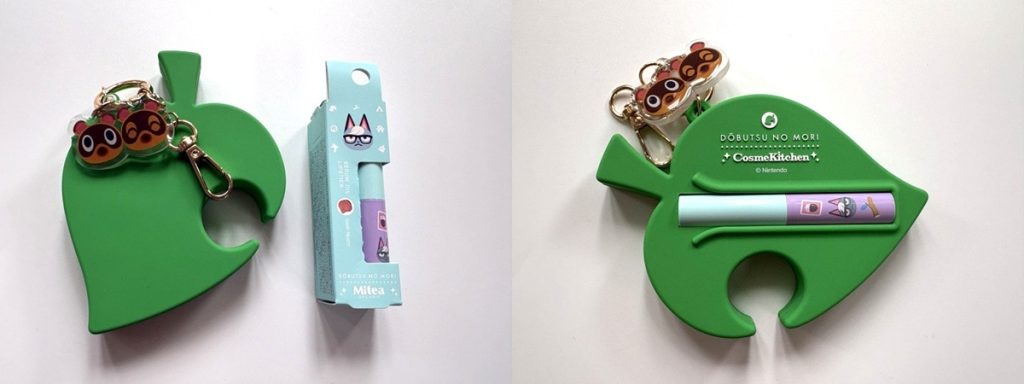 「どうぶつの森」の葉っぱのマーク型のリップケースと、ミティア オーガニックの限定リップ3色セットで、毎日持ち歩きたくなるチャーム型だよ♡